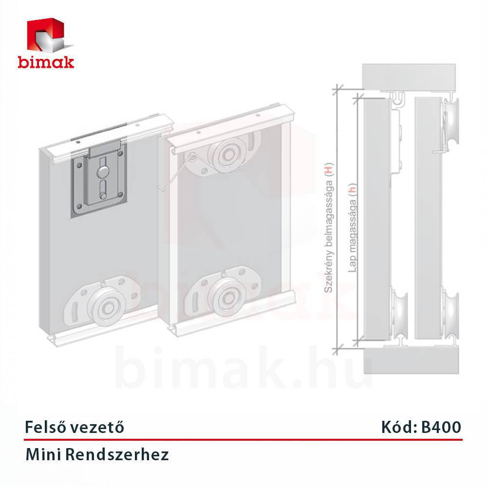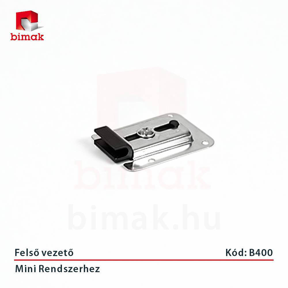 A B400 felső megvezető a Bimak Mini tolóajtó rendszer nélkülözhetetlen alkatrésze, amely az ajtólapok felső sínben (B400-as sínprofil) való precíz megvezetéséért felel. Ez a típus nem görgős, hanem egy speciális, alacsony súrlódású műanyag megvezetővel ellátott elem, amely csendes és stabil mozgást biztosít